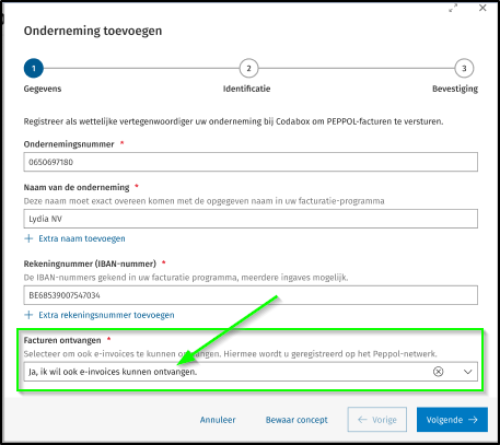 Om elektronische facturen te kunnen ontvangen moet bij registratie van uw onderneming in het veld Facturen ontvangen de optie Ja, ik wil ook e-invoices kunnen ontvangen geselecteerd zijn.