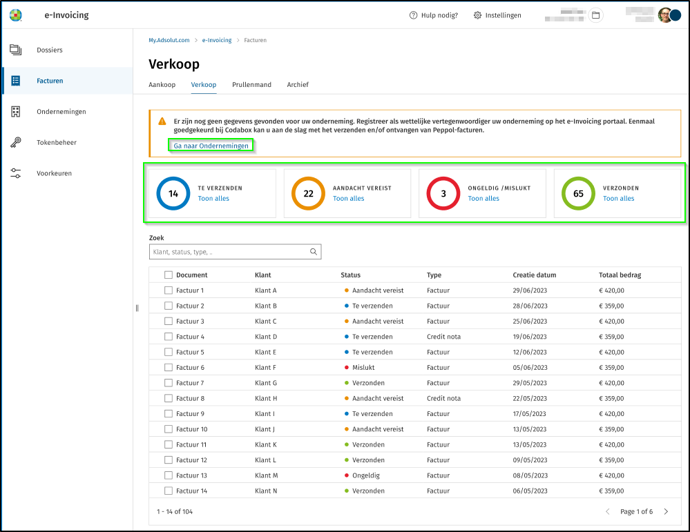Klik links in de verticale navigatiebalk op Facturen om een overzicht van de elektronische facturen op het e-invoicingportaal te bekijken.