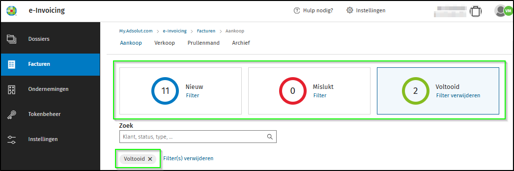 De filtertegel Voltooid verzamelt de documenten met de status Gedownload, Doorgestuurd en In boekhouding. Deze documenten hebben een finale status.