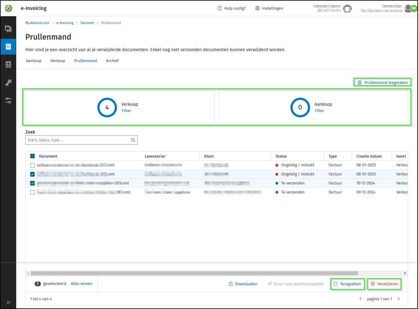 Let op: sommige documenten met de status Ongeldig/Mislukt kunnen mogelijk NIET worden verwijderd. Het gaat hierbij dan om documenten waarvoor Codabox feedback gaf dat een bestemmeling b.v. niet in de PEPPOL-gids kon worden teruggevonden. Deze documenten werden dus effectief al doorgestuurd naar Codabox, ook al konden ze daarna niet verder.